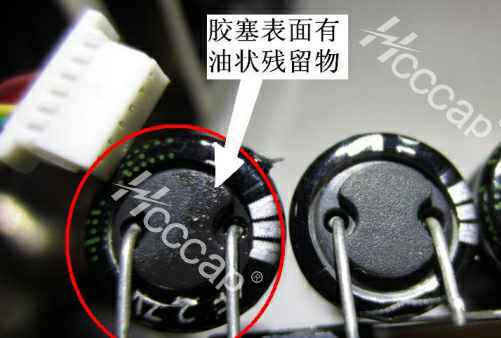 特征表现:PCB腐蚀区域有水油状液态残留物,而非白色或黄(棕)色电解质结晶,同时,电容胶塞底部液态残留物堆积较多;