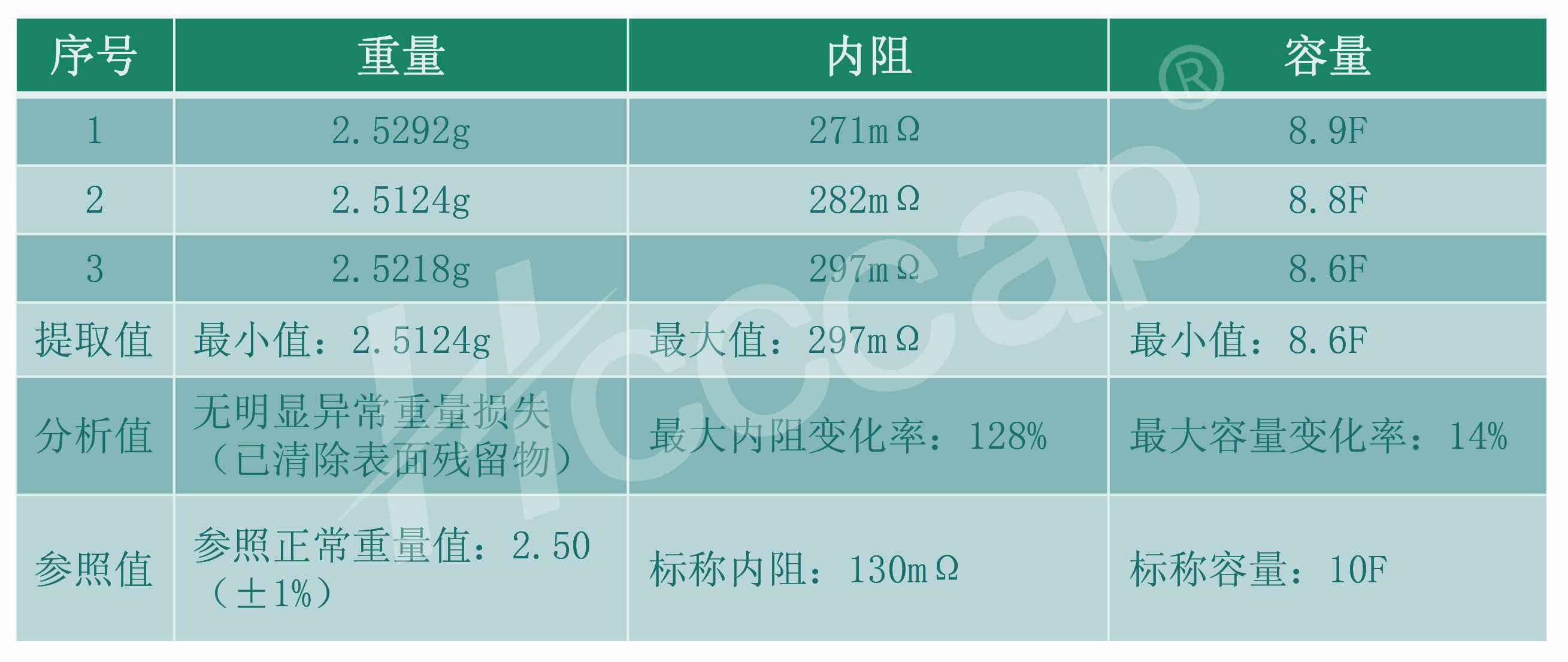 可见,问题电容产品在3~4年使用之后的容量、内阻和重量三项参数均符合正常自然衰减规律,未见失效或特性异常衰减。