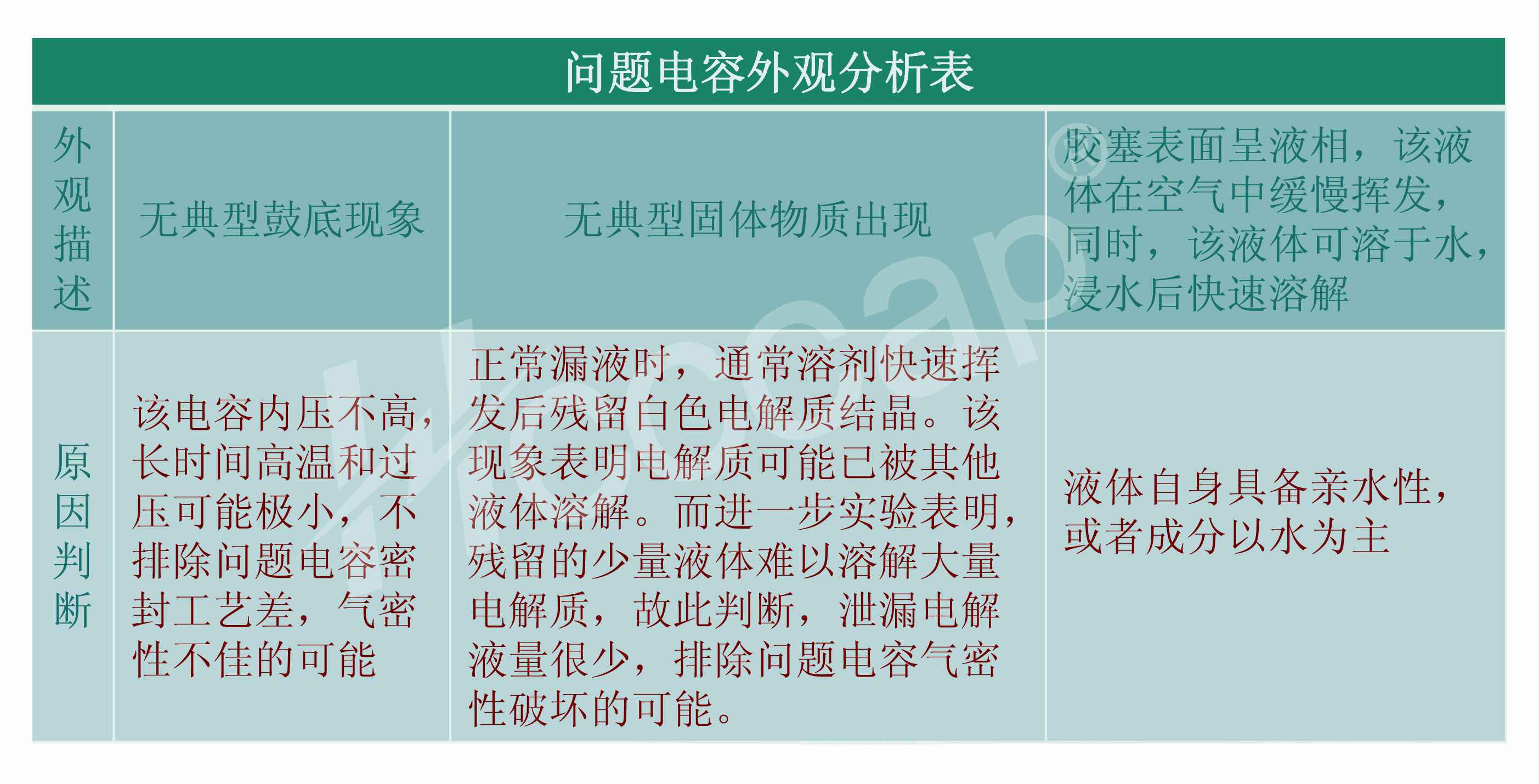 2. 凝露在电容胶塞底部堆积形成液态水,该水分未能在短时间内挥发 ,与泄漏出的微量电解液结合形成电解池。【电解池】【微量】