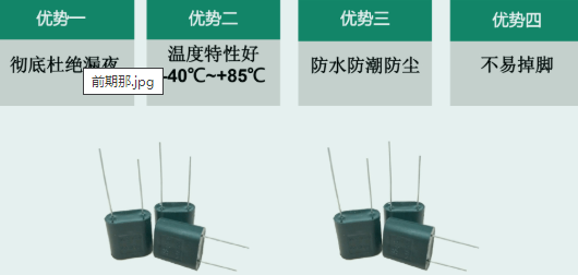 2. 脚间距偏小的超级电容(含其他类型正负极间距偏小的电容),由于固体表面的吸附特性,两极在较严重的凝露环境下易构成通路,特别是在凝露挥发困难或缓慢的地方。【脚距小】【带电】
